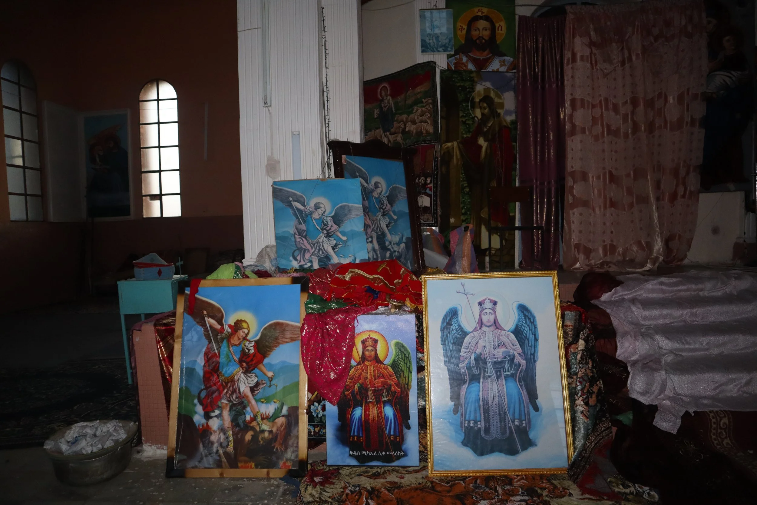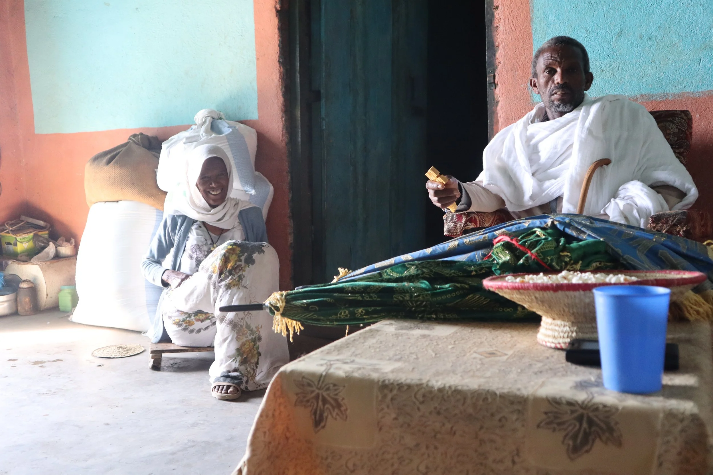 Above: My aunt Alem and the priest. Behind me was a stack of broken umbrellas from the church, meant for a repairer to take, restore, and resell them. These umbrellas were used during regular services at the church, meaning they smell of the incenses used during Quedasie. I decided on the teal and green umbrellas, to which Keshi Mengistab took out his cross and blessed them for me. I was crying so much my aunt’s laughing at me <3